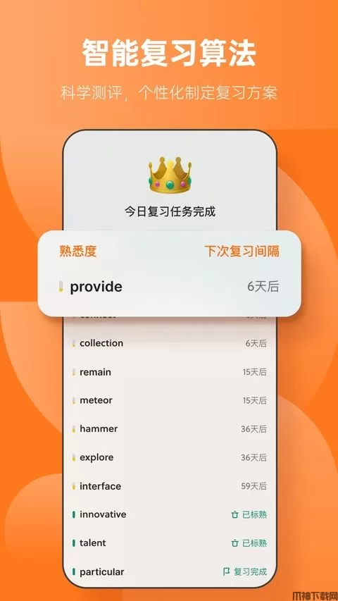 采用学习、复习两套科学的智能算法,自动根据你的记忆效果智能调整你的单词学习安排,固强补弱,重点突出,让你用最少的时间掌握最多的词汇。
