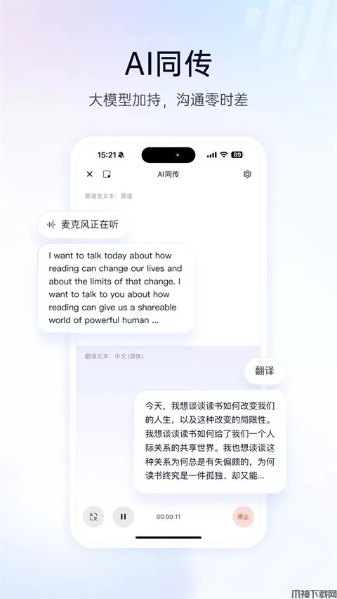 - 语音/对话翻译:实时语音翻译,支持中、英、日等21种热门语言的语音输入,更有英文口语打分纠音,助力口语提升。