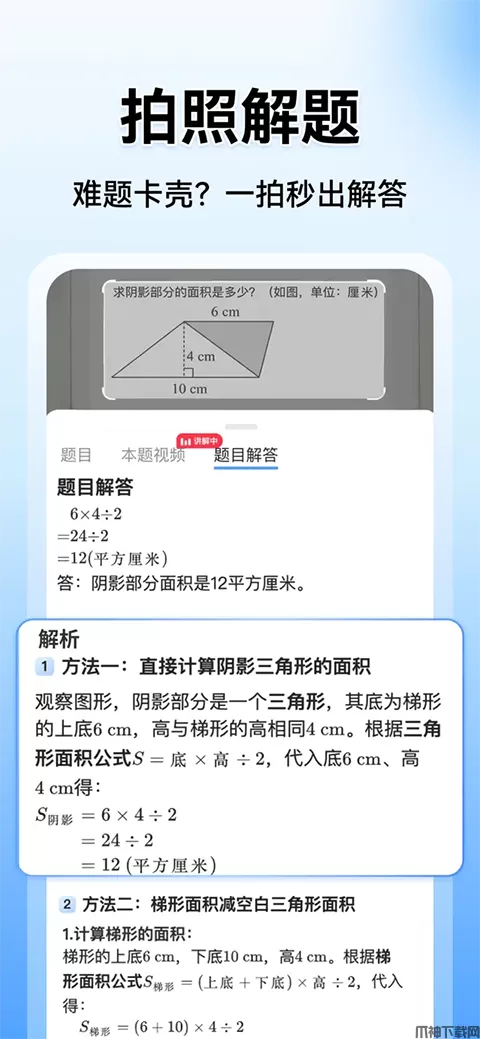 1、拍照就能搜答案解析,下载即用,无需注册,完全免费。