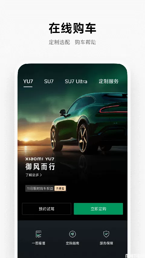 1、购车:小米汽车核心亮点和技术参数介绍,可预约试驾,配置并定购你的小米汽车,支持在线处理提车待办事项。
