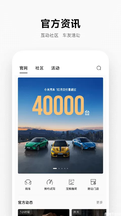 2、社区:了解小米汽车品牌资讯,交流用车体验,分享精彩车生活。