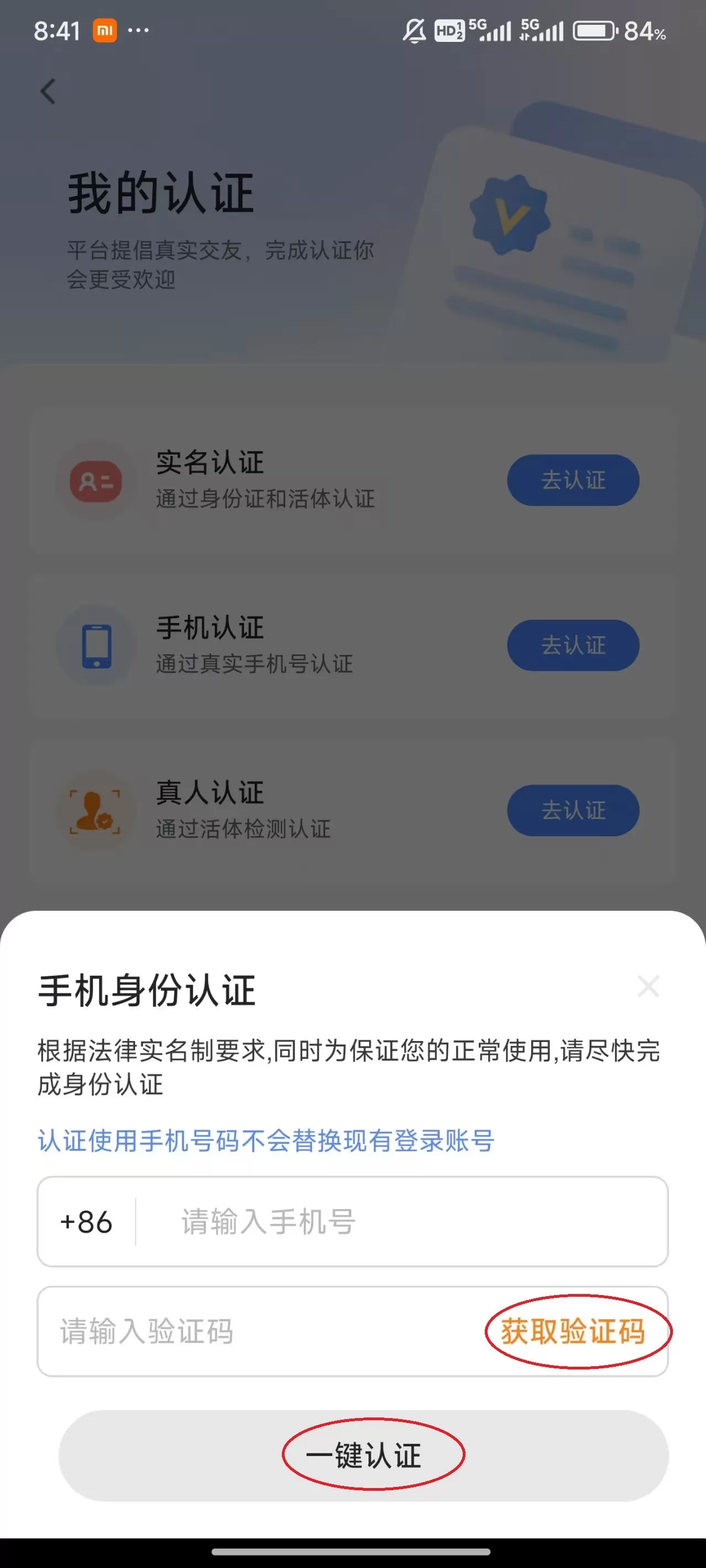 5、手机认证,输入手机号,点击“获取验证码”,输入验证码后,点击屏幕下方的“一键认证”。
