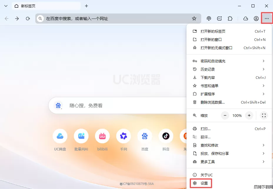 1、电脑UC浏览器电脑版右上角的三个点,选择设置选项。
