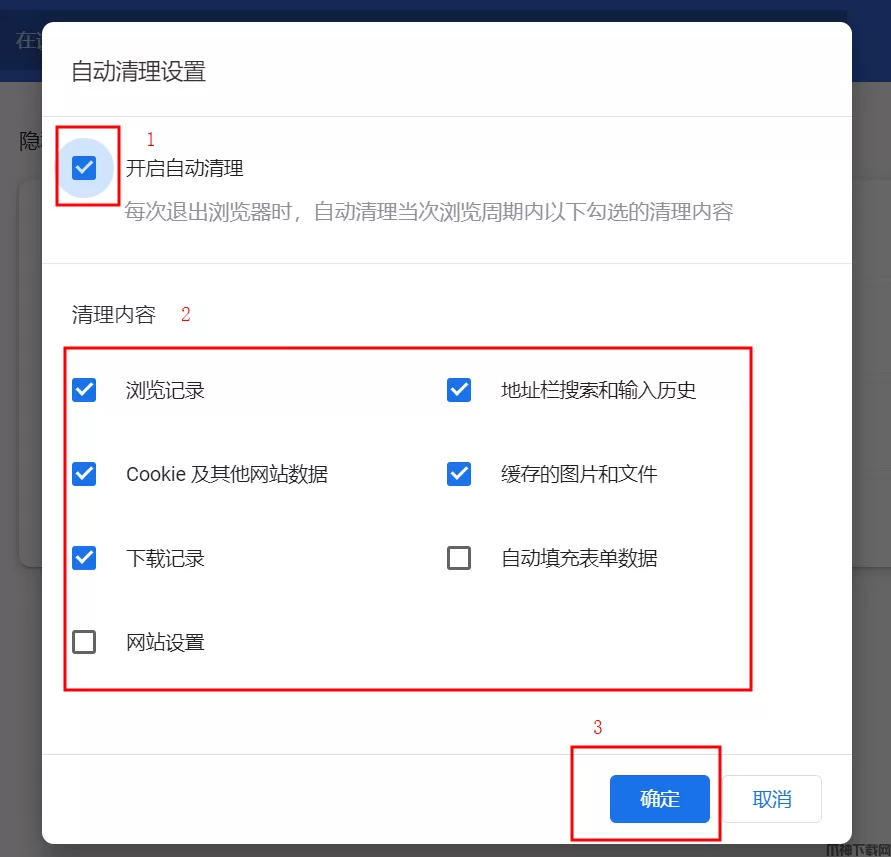 (1)点击清除面板左下角的文字提示“退出浏览器时,自动清除浏览数据”。