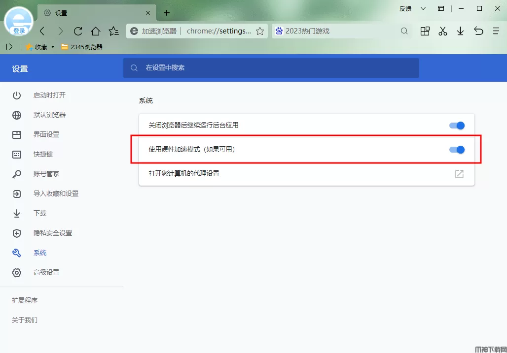 2、打开浏览器设置页,左侧选择“系统”,找到“使用硬件加速模式”功能并取消勾选。