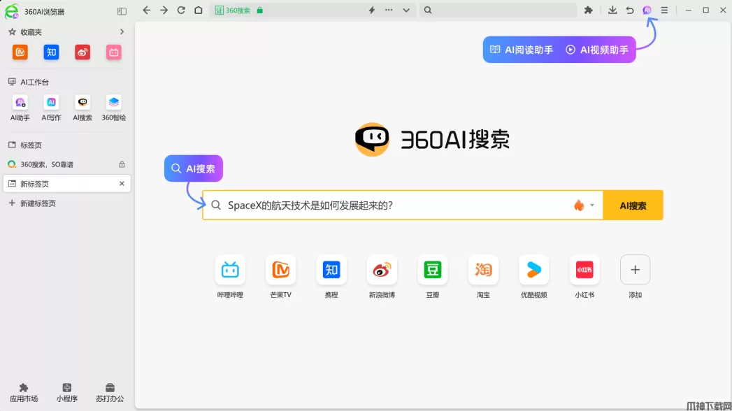 360AI浏览器官方版是360集团倾力打造的一款智能浏览器,融合了前沿的人工智能技术,旨在为用户提供高效便捷的网络浏览和信息获取体验。它不仅提供了AI搜索、AI阅读助手、AI视频助手等核心功能,更辅以思维导图生成、智能摘要、视频内容总结等多项实用功能,助力用户在信息海洋中游刃有余,提升浏览和学习效率。