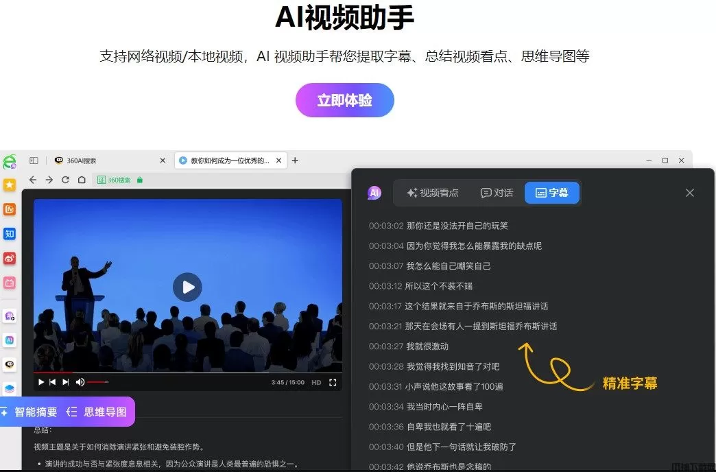 AI视频助手能够自动分析视频内容,提取关键信息,并生成思维导图,助力用户快速理解视频的主要内容,节省观看时间。