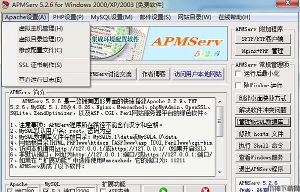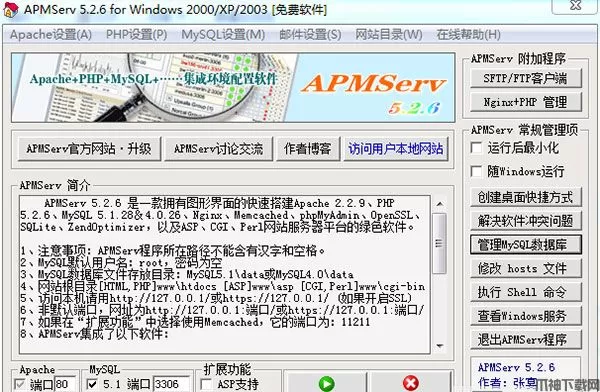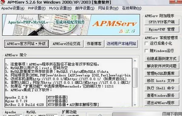 apmserv 5.2.6是一款拥有图形界面的快速搭建Apache2.2.9、PHP5.2.6、MySQL5.1.28&4.0.26、Nginx0.7.19、Memcached1.2.4、phpMyAdmin2.11.9.2、OpenSSL