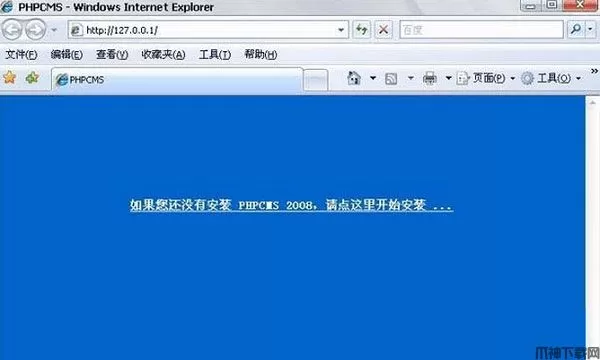3、phpcms官方网站下载最新版的phpcms程序,下载后解压到D:\APMServ5.2.6\www\htdocs,运行http://127.0.0.1出现如下画面,提示你要安装phpcms2008程序