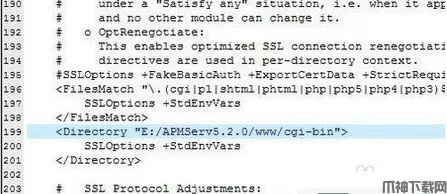 3、我们可以看到,系统已经帮我们记录了错误的起源地址D:/HySzWork/APMServ/Apache/conf/extra/httpd-ssl.conf 。是这个文件的第199行出现了问题,我们来看看是什么问题,如图
