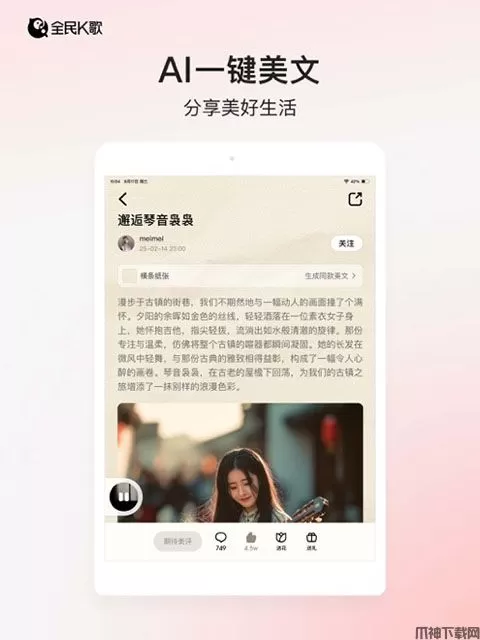 全民k歌ipad版是一款腾讯旗下的k歌软件,具有智能打分、专业混音、好友擂台、趣味互动和社交分享等功能,让用户足不出户就可以享受到在KTV唱歌的感觉。