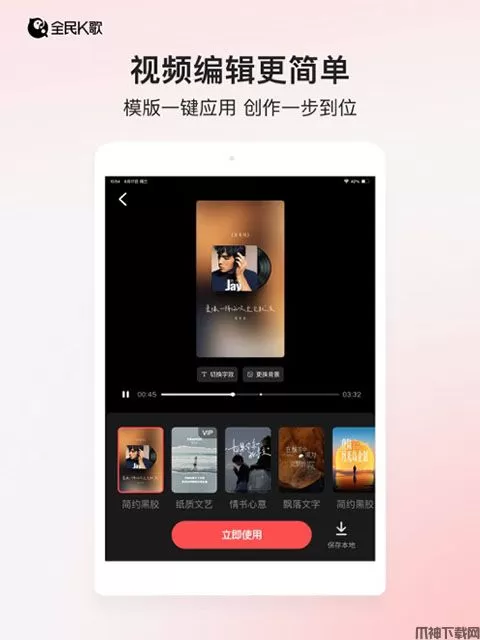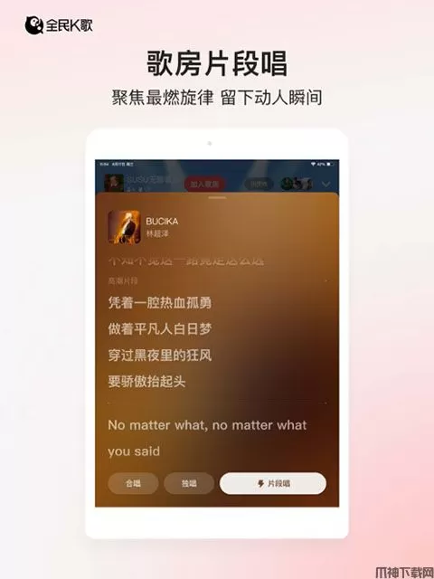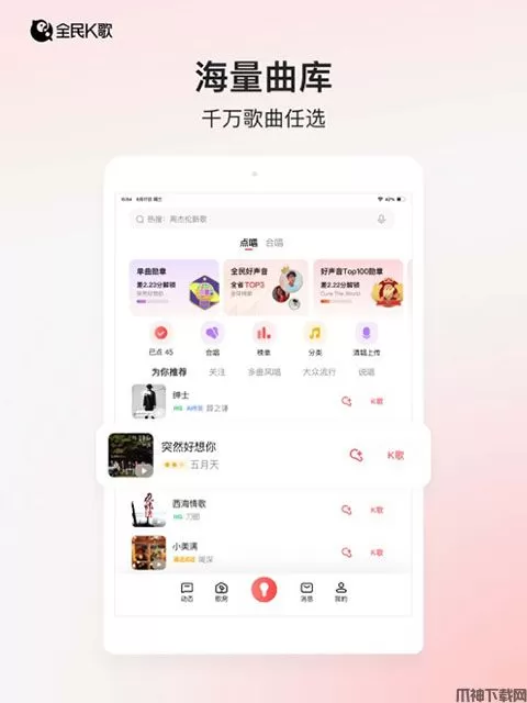 全民k歌ipad版是一款腾讯旗下的k歌软件,具有智能打分、专业混音、好友擂台、趣味互动和社交分享等功能,让用户足不出户就可以享受到在KTV唱歌的感觉。每个人都喜欢唱歌这种可以放松心情的方式,可是在KTV中和朋友们一起唱歌,相信大家都有碰到这样的情况,喜欢唱歌的麦霸就会抢过话筒从开头到结束都没离手,让你都没有机会来展现自己的歌喉,不过有了这款软件就可以随时展现自己的歌喉。即时你五音不全也不用担心,全民k歌ipad版还具有独特的歌曲段落重唱功能,不需要你单独去KTV练歌,也不用买什么昂贵的设备,通过反复的练习在短时间内你也可以唱出优美的歌曲。