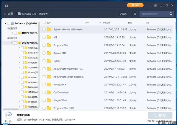 扫描过程中,软件会自动显示已扫描完成的百分比,找到的文件个数及剩余时间。
