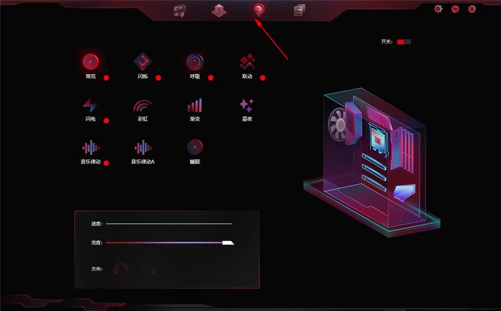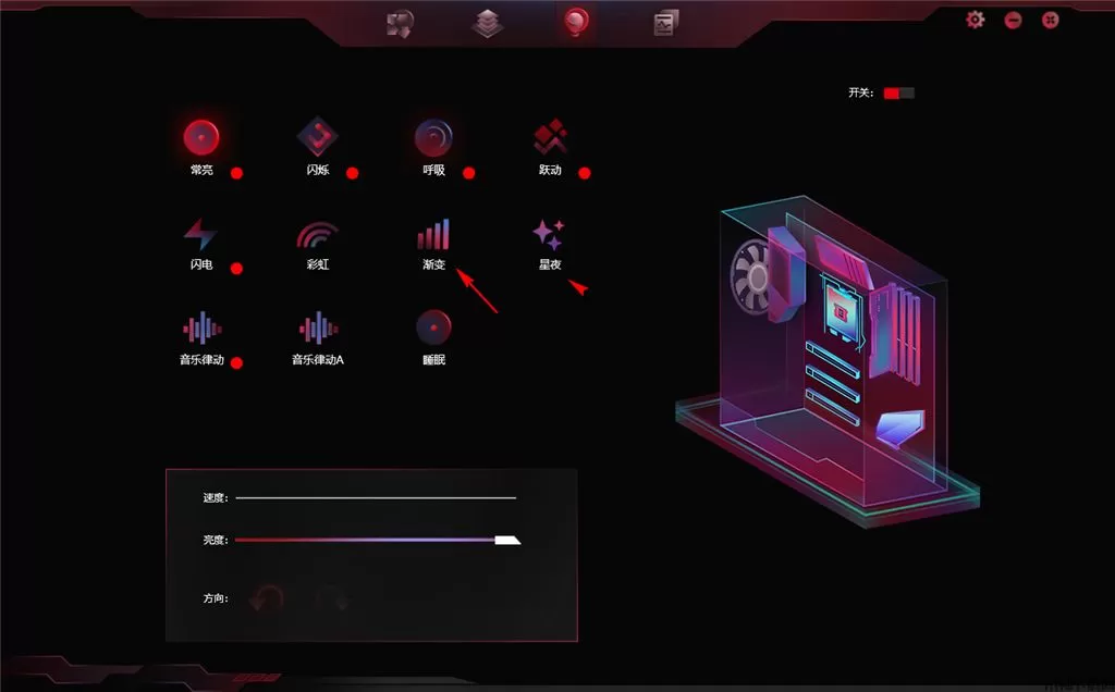 2、整机灯效设置功能,可以这是软件设置机箱的灯光颜色效果,可以设置见渐变,可以设置彩虹。