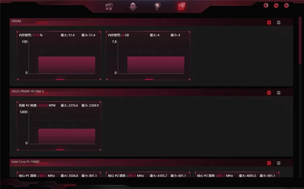提供CPU和显卡频率、温度、内存使用率等实时监控信息,以动画形式直观呈现,让用户随时了解系统性能。