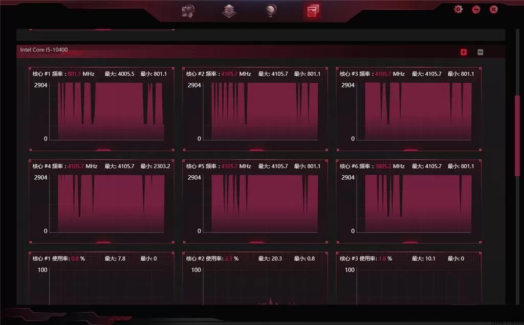 5、核心#1频率:801.1MHz、最大:4005.5、最小:801.1,每个核心的参数都可以在软件显示频率。