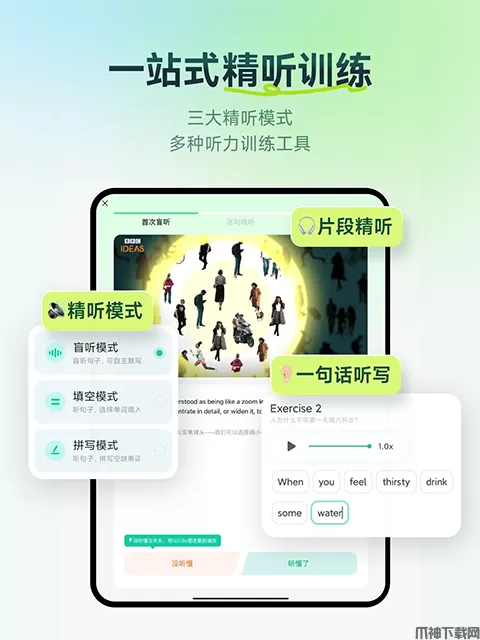 扇贝听力口语ipad版是一款专业的英语听力训练软件。
