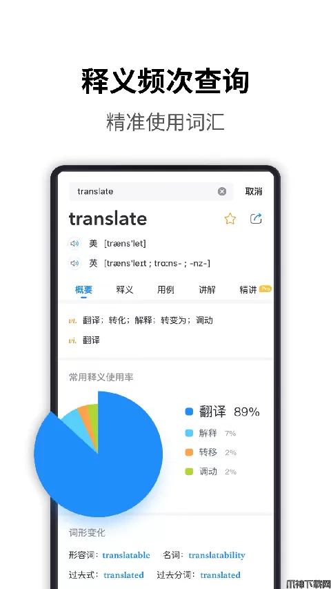 7、单词使用频率视觉化:释义饼图展示并按百分比降序排列,精准使用每个单词。