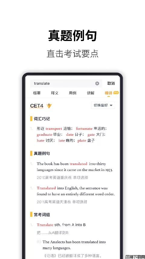 1、考频统计:大数据抓取词汇考频与考试形式,提供最经典的历届真题案例,把握出题趋势,针对性复习。