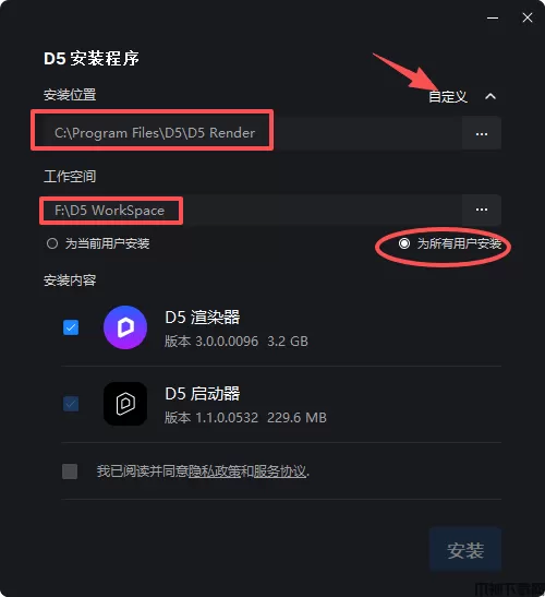2、如果需要更改安装路径,点击自定义,然后再点击为所有用户安装。在安装位置和工作空间设置指定的安装路径;