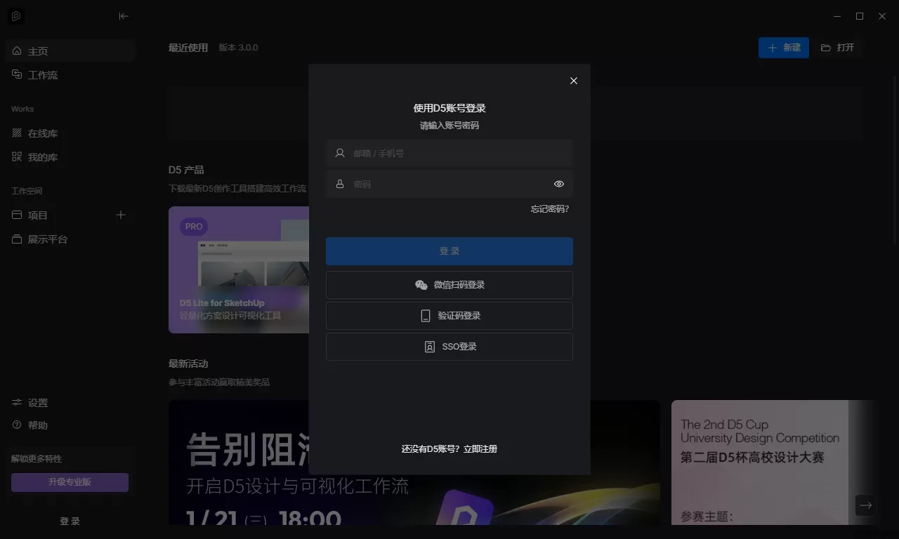 6、启动D5渲染器后,登录账号(没有账号就根据界面提示注册一个账号,免费的);