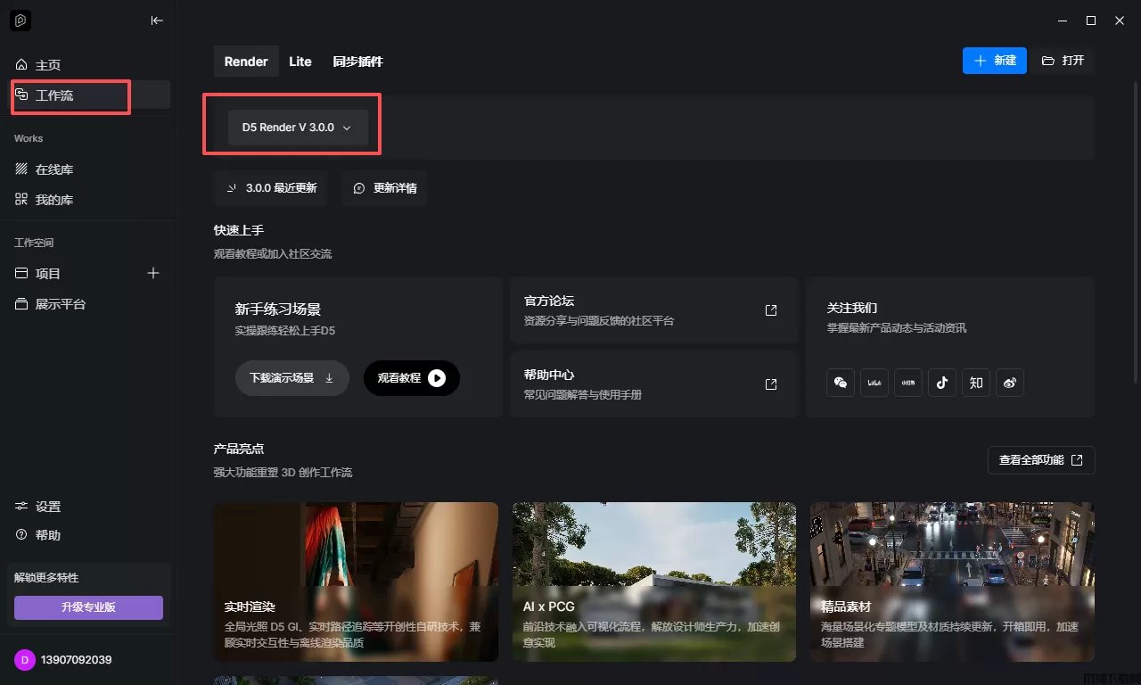 7、登录界面进入以后,点击工作流,就可以看到D5渲染器了。如果此时界面显示需要安装D5Render,就点击安装 D5 Render V 3.0.0.0091;