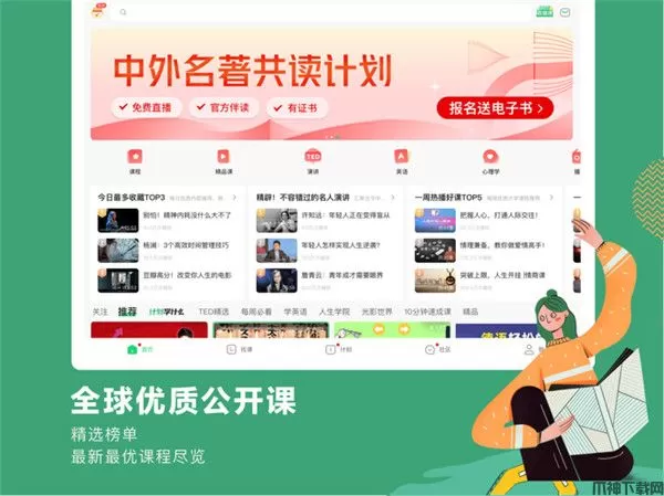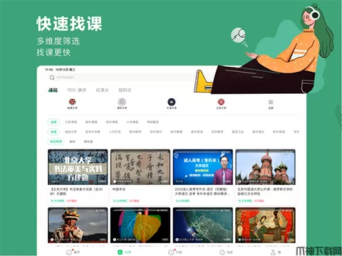 作为中国最大最全的课程视频平台,拥有来自国内外顶尖学府的海量名师名课,覆盖文学艺术、历史哲学、经济社会、物理化学、心理管理、计算机技术等二十多个专业领域;作为TED官方合作伙伴,向国内用户提供最新最赞的TED演讲;引人入胜又发人深省的纪录片、轻松易学的可汗学院,无数好内容就在这里等着你。