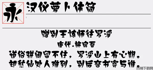 汉仪萝卜体简字体是一款汉仪类萝卜形状风格字体软件,该字体上边粗下边细,笔画粗壮活泼,构思新颖,风格独特。整体结构为上宽下窄,主要笔画上边宽大粗壮,下边由粗渐小、渐细,似箩卜形状。具有醒目,突出的视觉效果,可以适应于报纸和杂志和书籍中常用字体海报、个性促进品牌标志设计、字体设计、文本装潢、信息展示、篆刻制模英文、数据制作、装潢设计、视觉设计、字帖等一切合法应用场景,有喜欢的朋友可免费下载收藏。