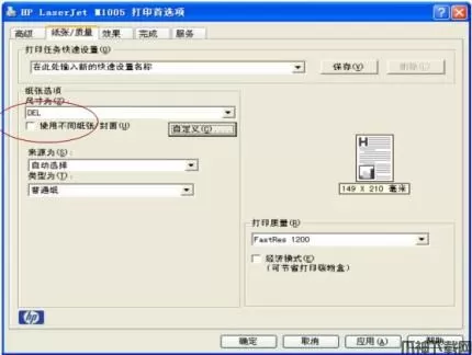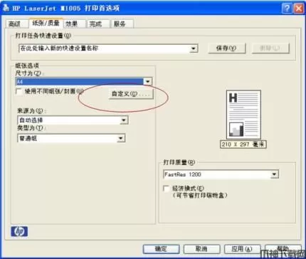 3、在打印首选项中选择纸张/质量下尺寸为自定义纸张,然后点确定;