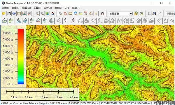 下载的高程数据可在GlobalMapper中打开后提取生成等高线,并可以将生成的等高线导出为SHP、DXF、TAB或KML等几十种矢量数据格式,生成的等高线效果如下图所示