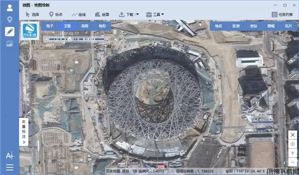 选择历史影像,可以查看谷歌地球的历史影像地图,2007年2月17日世界瞩目的鸟巢建设情况历史影像如下图所示