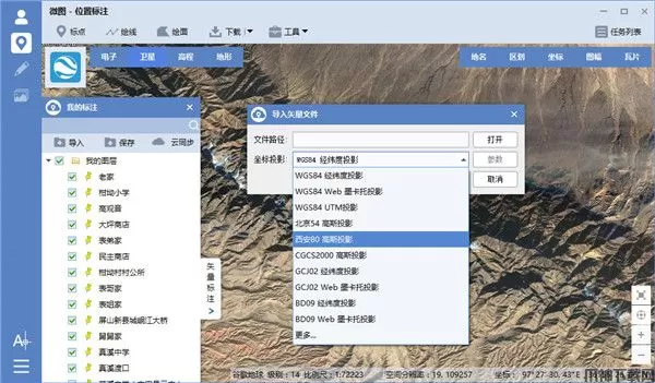 支持导入和导出多种投影的矢量数据,包括WGS84经纬度投影、WGS84 Web墨卡托投影、北京54高斯投影、西安80高斯投影、CGCS2000高斯投影、GCJ02经纬度投影、GCJ02 Web墨卡托投影、BD09经纬度投影和BD09 Web墨卡托投影等