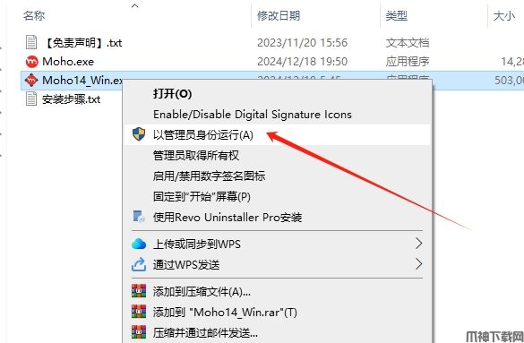 注:将杀毒软件和防火墙关闭,选择Moho14_Win.exe鼠标右键以管理员身份运行