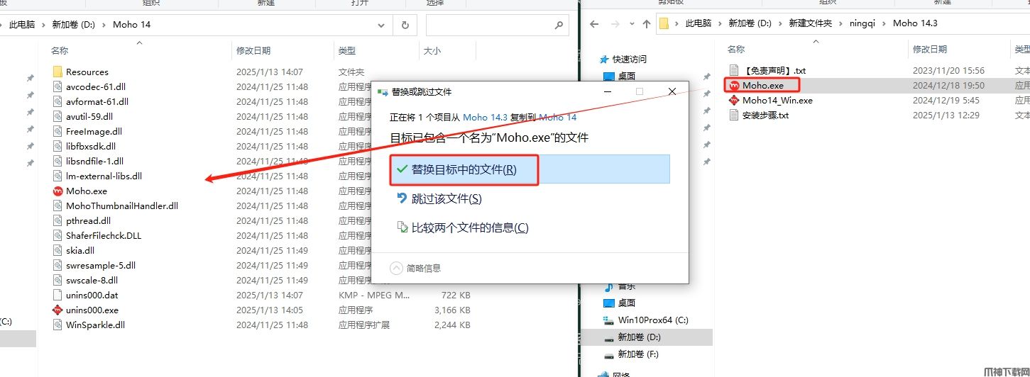 10、将补丁Moho.exe复制到刚才打开的软件安装目录位置下替换