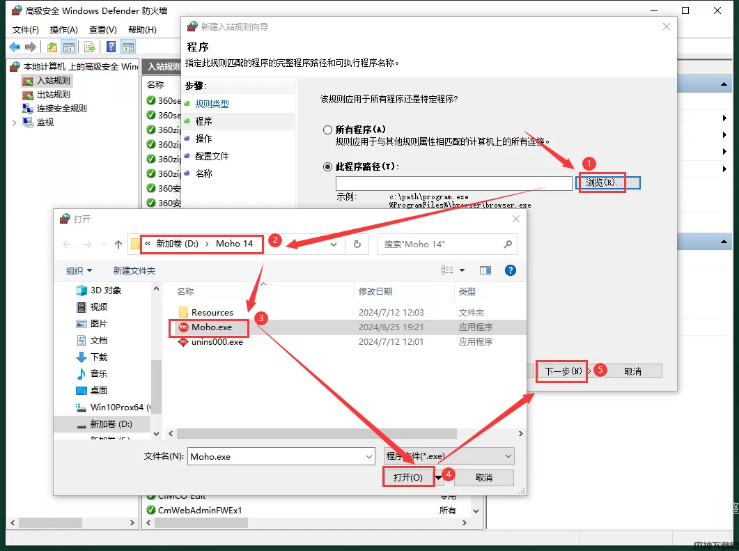 13、选择屏蔽的程序:点击【浏览】-找到软件安装目录位置,选择Moho.exe程序,点击【打开】,最后点击下一步