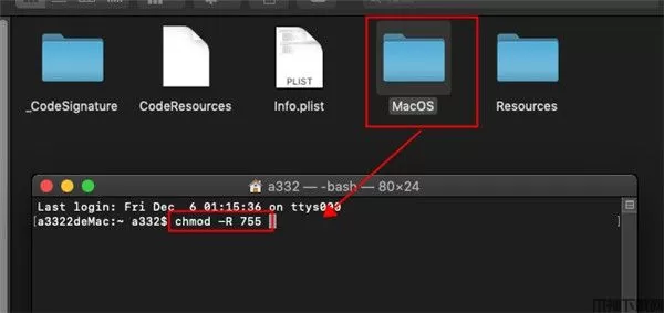 之后打开控制台输入:chmod -R 755 然后将MacOS文件夹拖入其中(记住不要忘记命令间的空格,以即权限755后面也是有空格)