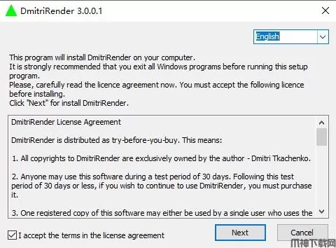 2、首先点击dmitriRender_3.0.0.1.exe,选择同意条款继续安装;