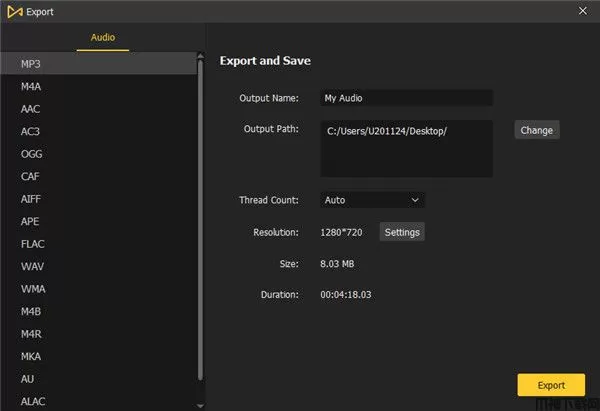 现在单击顶部菜单栏上的“导出”>“导出音频”。在弹出窗口中,选择您想要的输出音频格式,例如 MP3、WAV、M4A、AAC 等。然后单击“导出”按钮将音频文件保存到本地计算机。