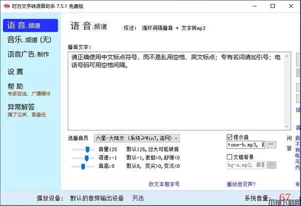 4、便捷播放方式:生成的音频可直接保存至MP3等设备使用,也可通过电脑连接音响进行实时播放,方便快捷。