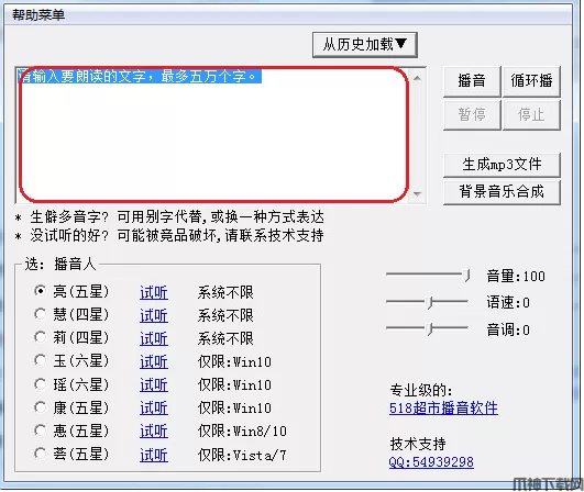 具备文字转语音、背景音乐合成、语音参数调节等核心功能。