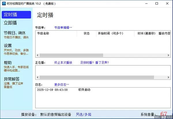 时方校园定时广播系统是一款用于支持学校定时广播的定时音乐播放软件。通过电脑软件实现音乐的定时播放,并将其输出接到扩音器中,借此来实现对学校的早晨跑步、广播体操、眼保健操、打铃等音乐播放。它能够支持一次性、每天、每周、每月的定时播放,开机自动运行等操作,让日常广播变得轻松。由于高档设备售价贵、维护成本高、操作难等缺点,使得时方校园定时广播系统受到很大的欢迎,只要有电脑、软件、扩音器即可使用。欢迎下载体验!