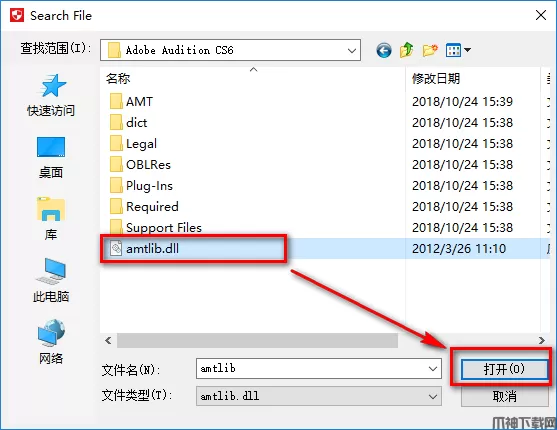 17、在弹出的文件资源管理器中,找到软件安装目录(第7步设置的路径)下的amtlib文件,点击“打开”。默认路径为:C:ProgramFilesAdobeAdobe Audition CS6;