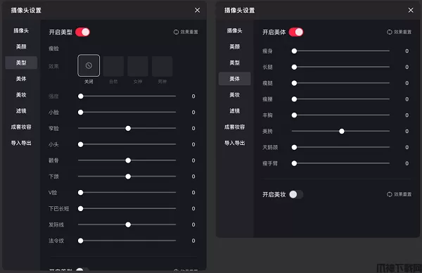 支持美型41个顶,美体8项,各组合风格妆容、眼影口红等各项妆容自由调节,支持导入导出参数。