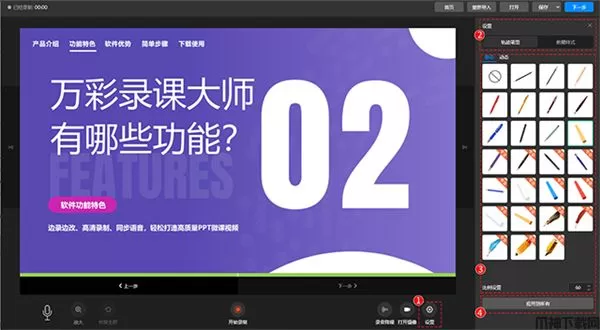 1、录制课程视频:万彩录课大师提供了强大的录制功能,可以帮助用户轻松录制高质量的课程视频。用户可以选择录制整个屏幕、特定窗口或者自定义区域,同时还可以选择录制系统声音和麦克风声音。