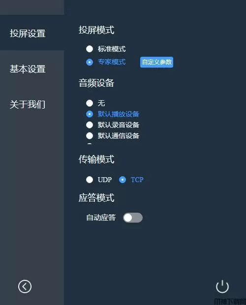 3、投屏设置,您可以设置投屏模式、音频设备、传输模式、应答模式