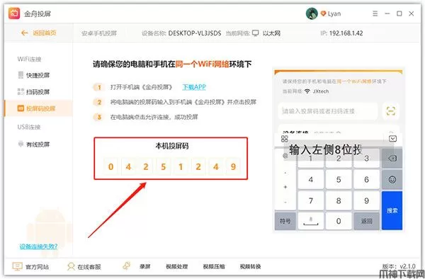 软件支持手动输入投屏码进行投屏,投屏码每隔一段时间后会自动更新,所以请及时在手机端投屏APP中输入正确投屏码。