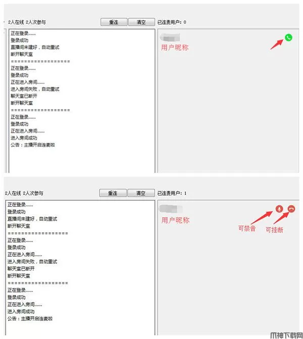 5、点击接通后,主播已接通粉丝的连线;当粉丝音质不好或暂时不需要发言时主播可点击静音按钮,此时该粉丝的发言将不会被播放,当连麦环节已结束时,主播可点击挂断按钮,结束与该粉丝的连麦