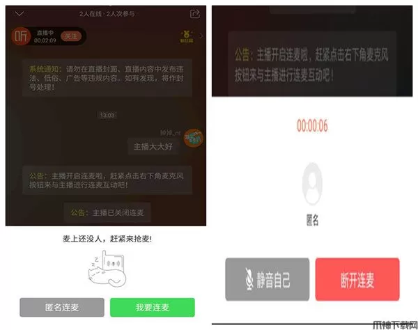 2、点击右下方绿色的连麦按钮后,会出现如下图一所示的情况,可以选择连麦或匿名连麦