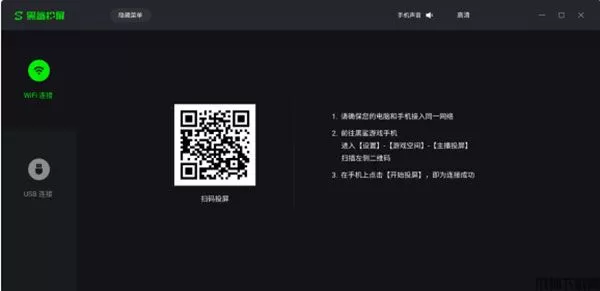 1、前往黑鲨游戏手机【设置】-【游戏空间】-【主播投屏】,扫描客⼾端【WIFI连接】中的二维码。如在手机【设置】中未发现【主播投屏】,请将手机系统升级为最新版本。