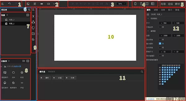 5、资源功能栏:可以跳转到教程、开发者论坛、素材库的快捷按钮。